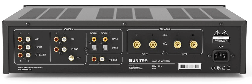 Het ontwerp van de WSH-605 combineert klassieke elegantie met praktische functionaliteit. Het hele chassis is gemaakt van metaal, met een fijne afwerking van geborsteld aluminium op het voorpaneel. Voor een gemakkelijke bediening en nauwkeurige afstelling is het paneel voorzien van grote en robuuste bronselectie en volume-/balans-/toonregelknoppen, evenals opvallende tuimelschakelaars in retrostijl. De minimalistische lay-out en het fijne vakmanschap benadrukken de kwaliteit van de materialen en de nauwgezette aandacht voor detail van de ontwerpers.
